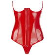 Corsetul are un fermoar pe toata lungimea in fata, facandu-l usor de imbracat si de dezbracat. Acest set include si un string din vinil rosu, completand tinuta pentru o aparitie spectaculoasa.